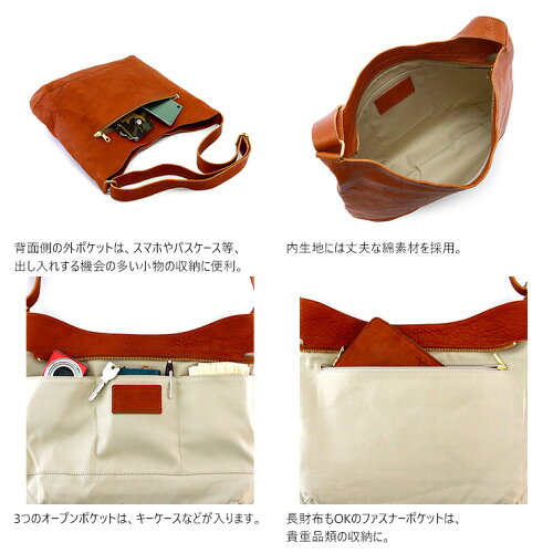 Detail 商品説明 ■素材:牛革 ■サイズ:W38×H33×D8(cm) ■重量:530g マチをとらずにタックを寄せることで、ふくらみを持たせたショルダーバッグ。